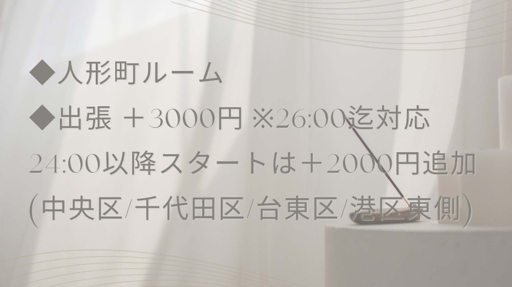 | ◆ご延長 | 10分 3000円 ※ご予約状況によります。 ※終了時間20分前からのご延長はお断りさせて頂く場合がございますので予め余裕をもったコース時間をご選択下さいませ。 |